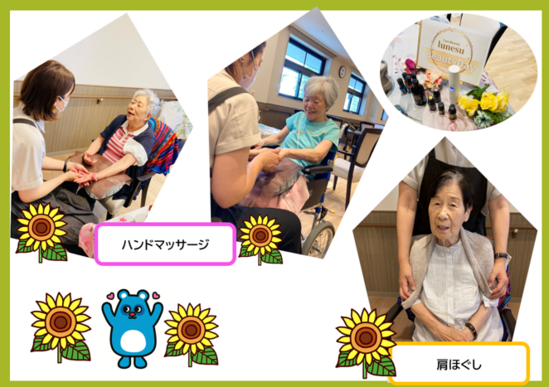 ハンドマッサージを受けられている利用者様からは、やさしく手を包み込まれるような感覚に「あったかくて、気持ちいいわ~」という声も聞かれ、笑顔がこぼれていました
