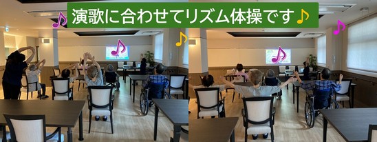 『大きく腕をまわす・足をのばしてそのまま5秒間キープする』など、普段の生活ではしないような動きを取り入れた内容で利用者の皆さんは音楽に合わせてのびのびと体操を楽しまれていました