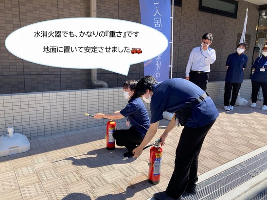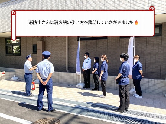 先日、施設内で防災訓練を実施しました。今回は消防署の方にも来ていただき、実際の避難の流れや消化器の使い方など、丁寧にご指導いただきました