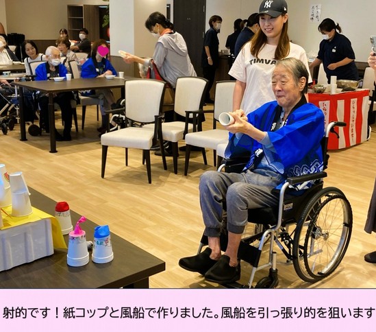 狙いを定める真剣な表情のご入居者様をスタッフも固唾をのんで見守ります