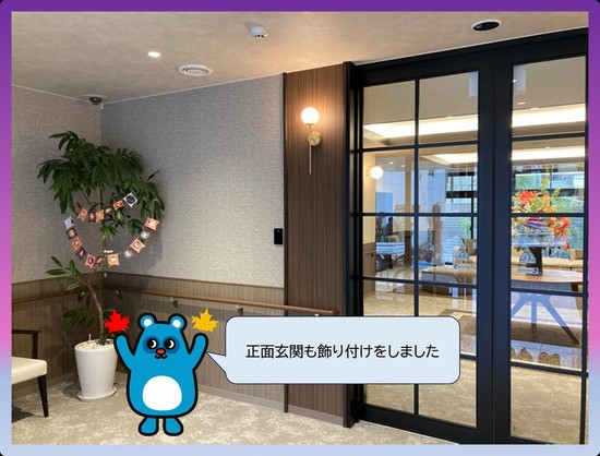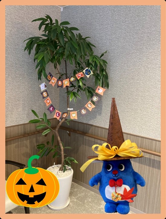 正面玄関を入り、向かって左側の観葉植物にハロウィンの装飾をしました。