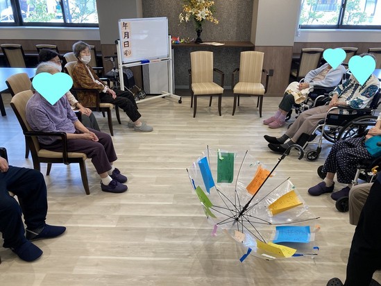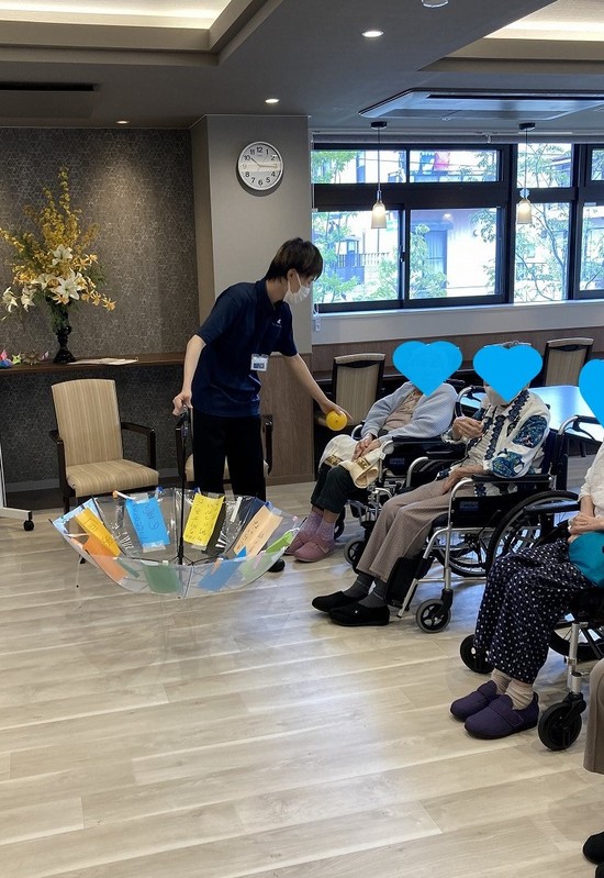 スタッフが、傘を回転させる間に、ご入居者様にボールを投げてもらい、