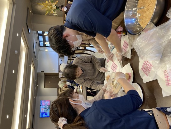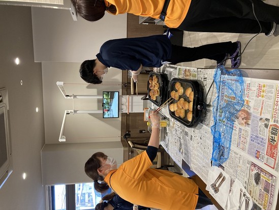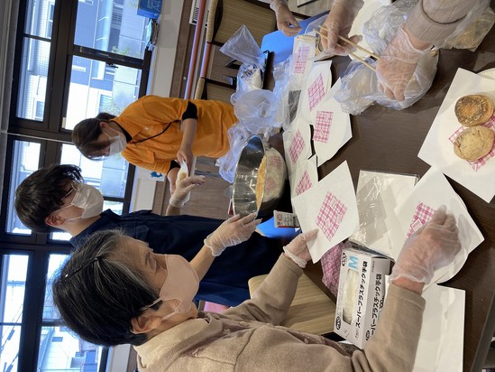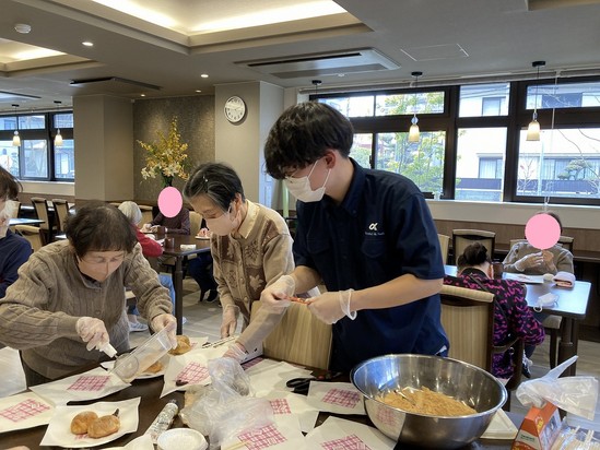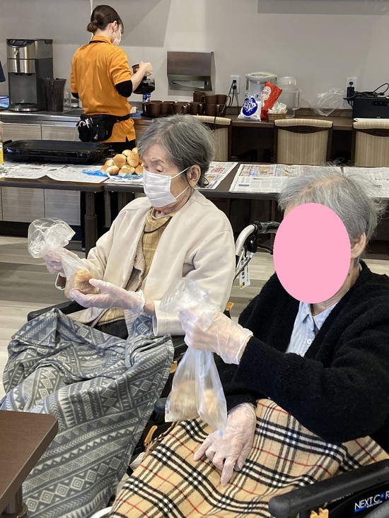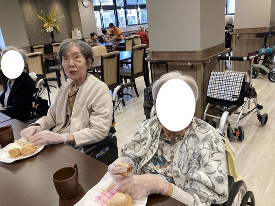 入居者様とスタッフでワイワイしながら、揚げパンが完成しました