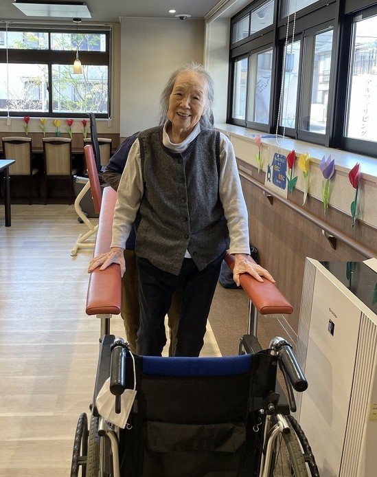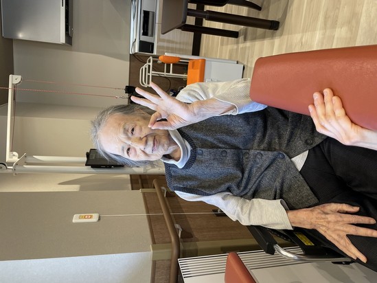 2025年05月10日(土) リハビリ頑張っています 週に2回リハビリの先生の訪問で歩行練習をされているご様子です。 ベッド上で足の曲げ伸ばし(関節可動域訓練)等行い、起き上がって座り車いすへの移乗の練習、その後1階レストランにある平行棒内を歩行されています。 天気の良い日で窓の外を見て「気持ちいいわねー。」と素敵な笑顔を向けてくださりました