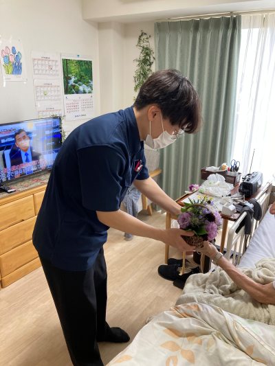 2025年06月16日(月) ご家族様からのプレゼント。 ご家族様が郵送して下さったお花を代わりにお渡しさせて頂きました。 お渡しすると満面の笑みで受け取られました。また、メッセージカードもあり読み終えられると感動しておられました。