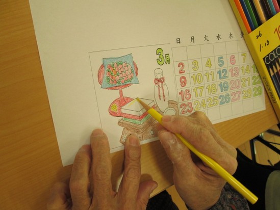 デイサービスでは、翌月のカレンダーの塗り絵をしています。