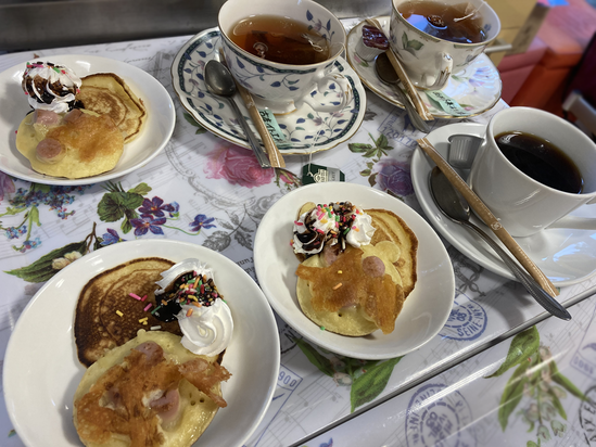 定番のシンプルなホットケーキに加え、魚肉ソーセージやチーズをのせたおかず系のものも登場! 生クリームを添え甘いものが好きな方も大満足していただけました♫