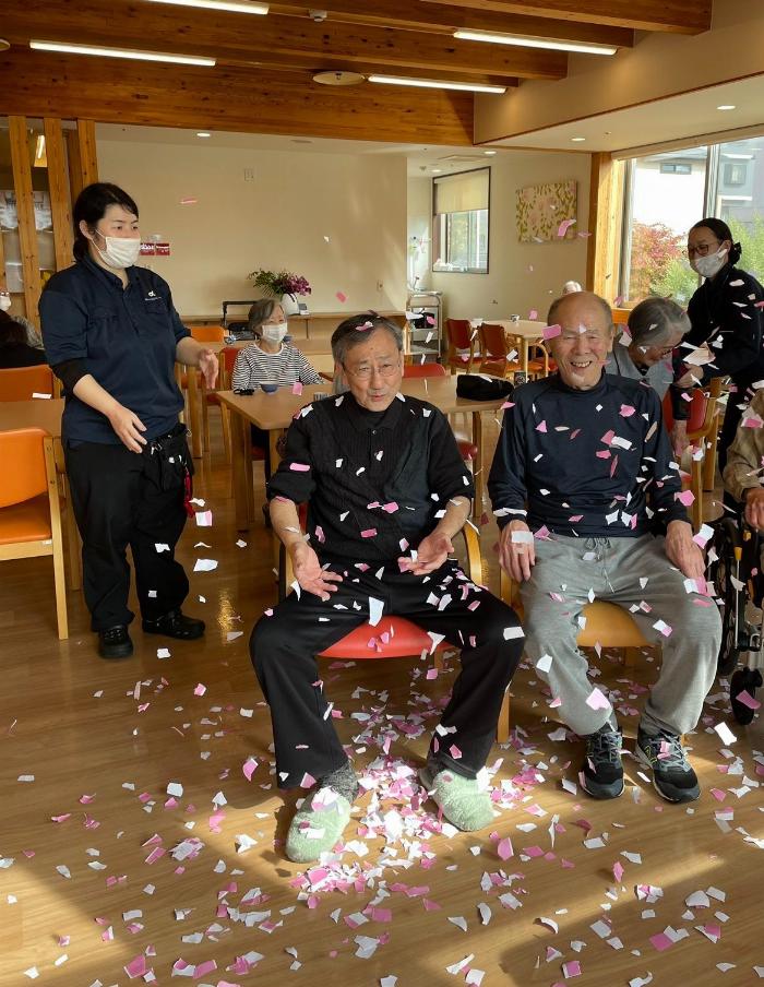 ご入居者様たちに、ピンク色の紙を破いていただき
