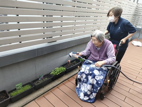 朝食を終え早出の深水さんと一緒に丁寧に水やりをされるM様♡ 早く綺麗な花が咲きますように✿
