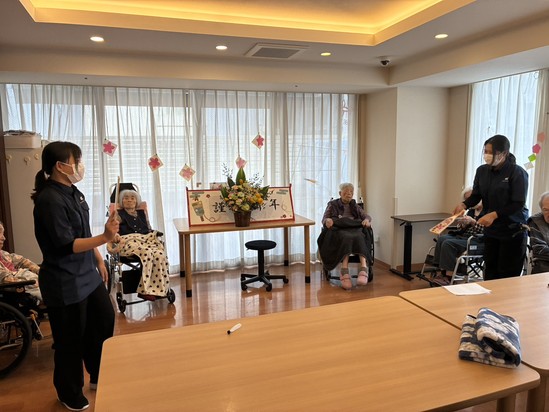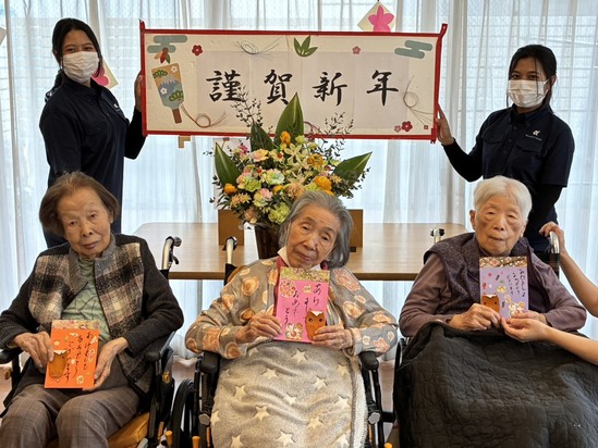 謹賀新年⁂ 完成したリースを持って、みなさまの居室入口に飾る前に記念撮影♬