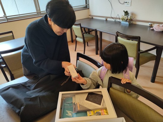 お孫さんを見守るような真鍋施設長(;^_^A 中身は小学校で役に立つグッズいろいろでした❀
