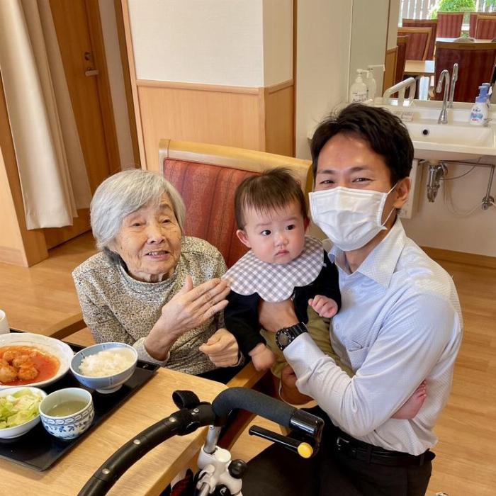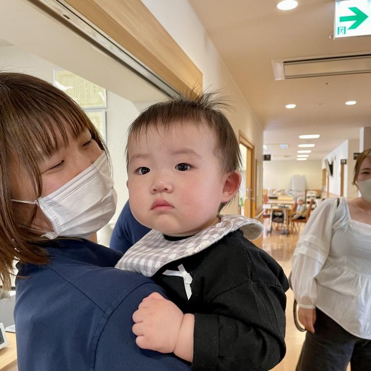 スタッフはもちろん、ご入居者の皆様も赤ちゃんの姿を見るなり笑顔が広がり、自然と温かい空気に包まれました。無邪気な笑顔や小さな仕草に、皆さんが癒され、穏やかな時間が流れていました。