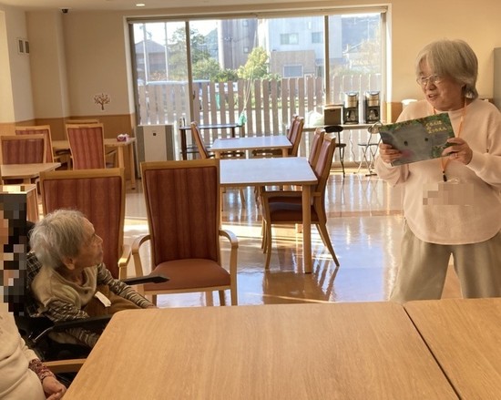 絵本の読み聞かせや入居者様とのおしゃべりを通して、何気ない日常の出来事から懐かしい昔話まで、丁寧に耳を傾けてくださる姿がとても印象的でした。