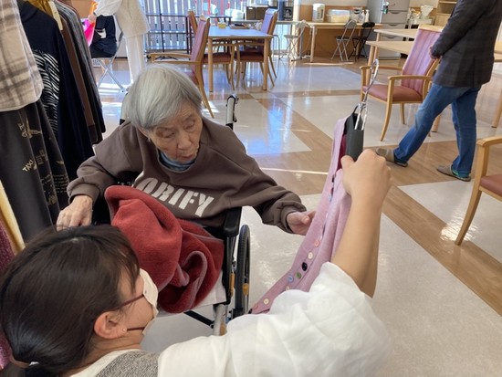普段、新しい衣類を見に行く機会が少ない方も多く、皆さま興味津々のご様子。 鏡の前で新しい装いを試されると、周囲からは「とても素敵!」と温かい声が上がり、笑顔が広がっていました。