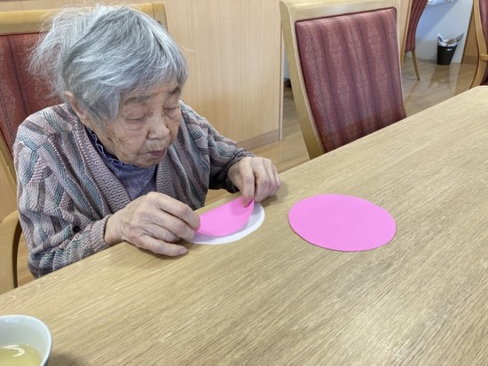 春らしいピンク色の色紙を丸く切り、