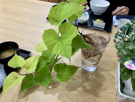 当施設のお客様の中には、お花や植物をこよなく愛される方がいらっしゃいます。最近、その方がサツマイモの切れ端を水につけて育て始められました。