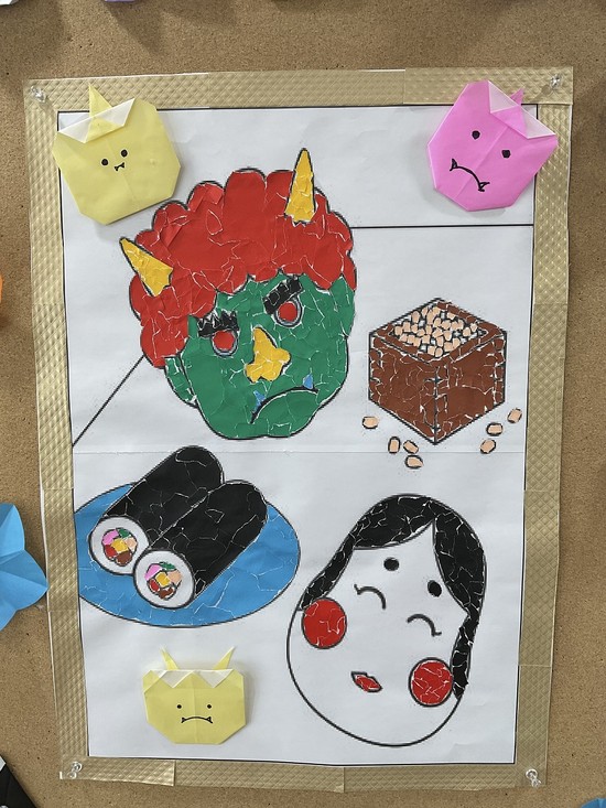 鬼や恵方巻、豆、おかめと折り紙をちぎっては貼り、ちぎっては貼り。