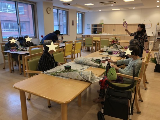 と先生に教えてもらいながら、ニコニコ顔で生けてます。