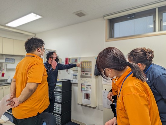 国分消防設備様には火災報知器、スプリンクラーなどの操作方法や対応方法をご助言いただきました