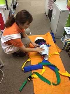 今回は自力避難困難な入居者様役に「あーなちゃん」に活躍して頂きました。