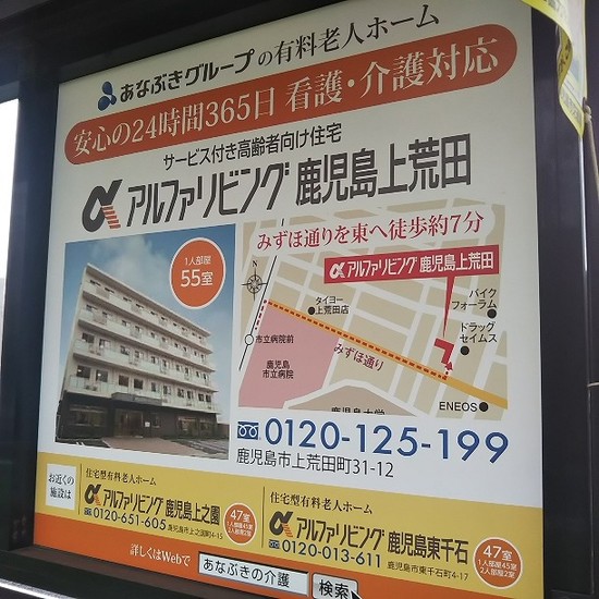 2020年09月12日(土) 【電停看板】アルファリビング鹿児島上荒田~ 市立病院前の電停に「アルファリビング」の看板が設置されました♪ ちょっと遠くからの写真も。 お車でお越しの際は一方通行なども御座いますのでお気をつけてお越し下さいませ。