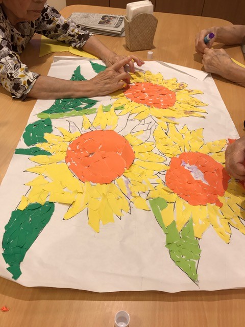 今回のレクのバ☆で 元気なひまわりの貼り絵が完成しました