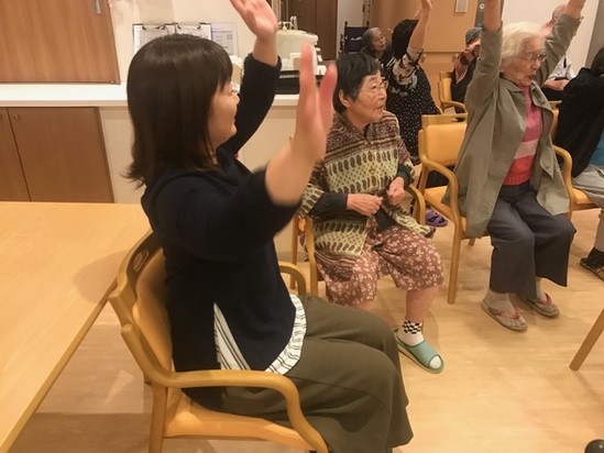 発声練習から始まり 歌を歌い 音楽にあわせて柔軟体操をしました