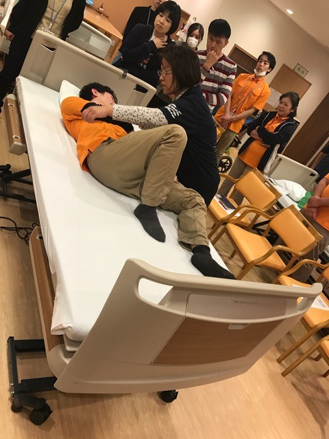 福祉機器でのベッドから車椅子への移乗介助も伝授して頂きました ●~*