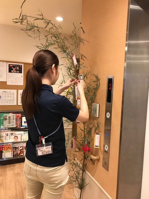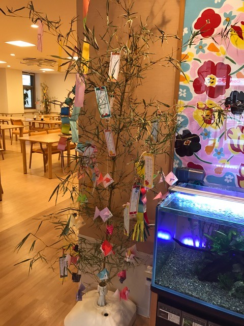 入居者様 スタッフの願い事を書いた色とりどりの短冊も飾りました