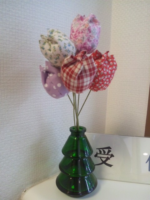 2015年03月21日(土) チューリップ♪ 受付に ちょっと変わった ? チューリップを飾りました 布で作った 手作りチューリップなんですよ ~ (*^_^*) 花瓶もかわいいので 受付にいらしたら ぜひご覧ください