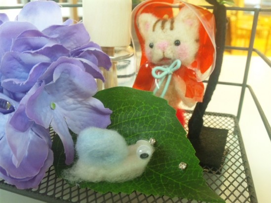 梅雨の時季を思わせてくれるキュートな飾り物 ただいま受付に展示中です