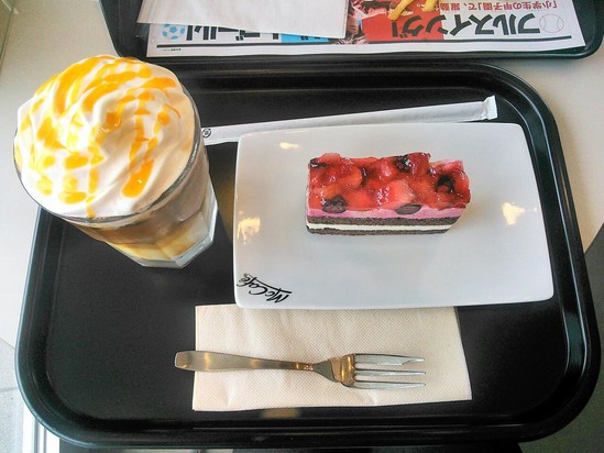 アイスオレンジフレーバーラテとダブルベリーのケーキ↑