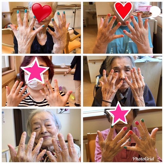 初めてネイルをされる方もいて、最初は不安そうでしたが「こんなのしたのは初めてだわ!キレイな色ね」 と言われ、他の利用者さんにも見せていました
