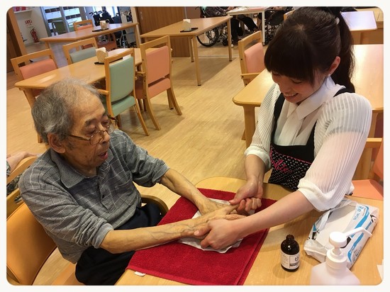 ハンドマッサージをしてくれている先生がとてもキレイで、男性の利用者さんはいつもより笑顔でとても 嬉しそうにマッサージを受け、楽しそうに話しをされていました