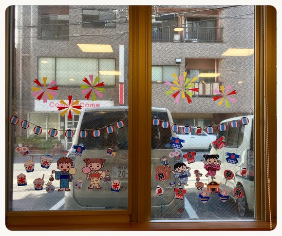 利用者様が切ってくれたイラストをみなさんの意見を聞きながら、職員が窓に貼っていきました(^^)v