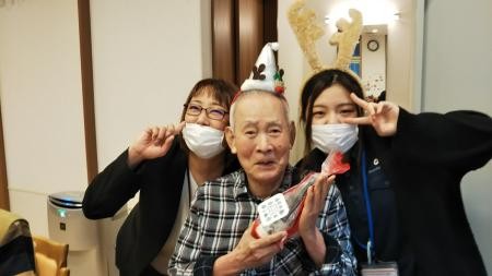 プレゼントもさせていただき、施設長とスタッフと3ショット!