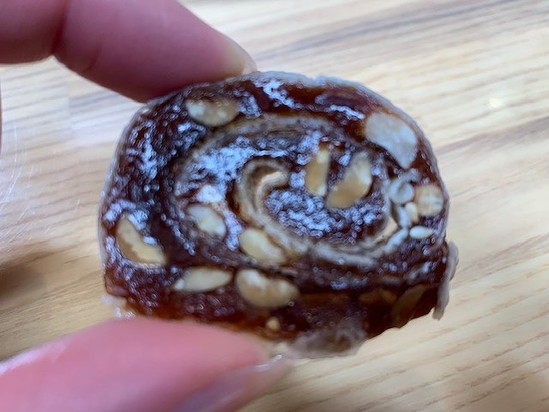 生姜・トマト・ナッツが 春巻きの皮で巻いているお菓子です。