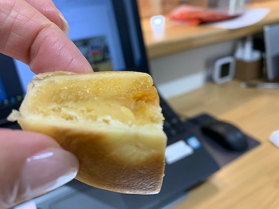 緑豆をねってあって、白あんのような食感の中にゆでた卵の黄身とドリアンが