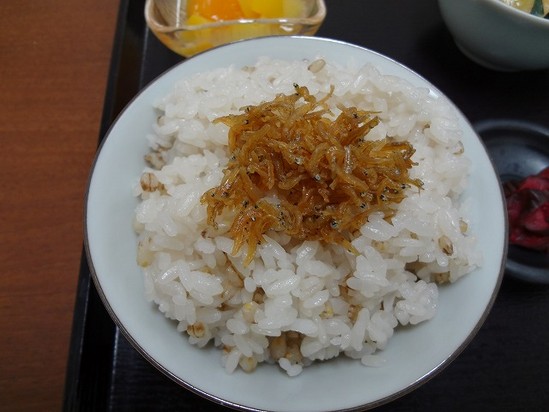 もち麦というのがあるそうで、これを混ぜて炊き上げたもので・・・とっても”もちもち”として美味しかったです。