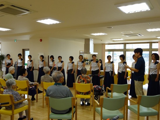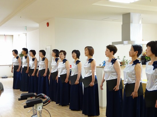2014年06月17日(火) コーラス 先日慰問に来てくださいました、コーラスグループ「ポリ・テイューン」の皆様です。 メンバーの中に入居者様のご家族様がおられ、今回の慰問となりました。 本格的に活動をされておられるだけあって、衣装も歌声もとてもすばらしかったです。