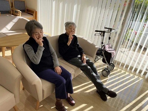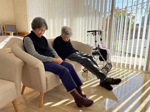 2024年11月21日(木) 秋の昼のひととき ある日の午後 ソファーで楽しそうにおしゃべりして 日向ぼっこしていたお二人です 5分もしない間に…お昼寝されていました 気持ちよさそうですね デイサービス前の様子でした。