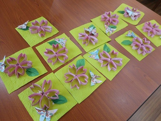 午前中は手作業として、桜の壁飾りをつくりました。