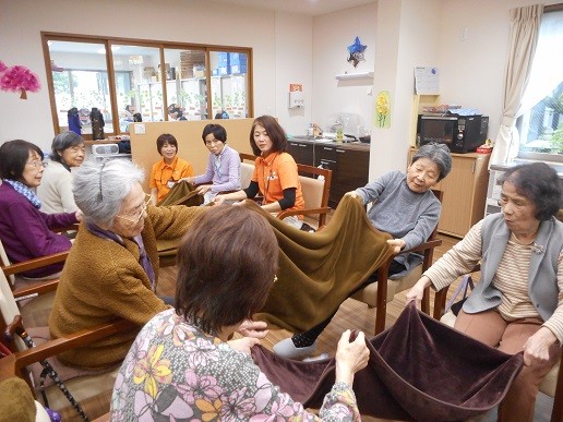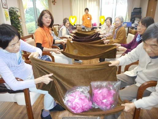 ひざ掛けで力を合わせ、花を送っていきます。