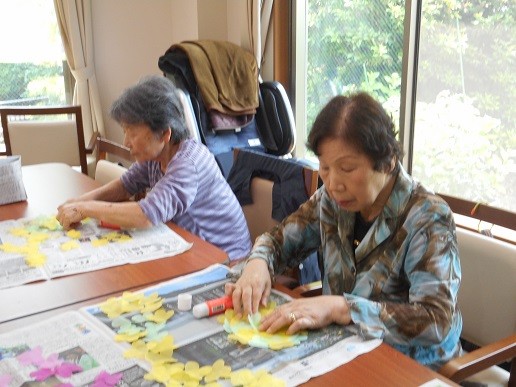 色画用紙にお花の形の花紙を貼り付けていきます。