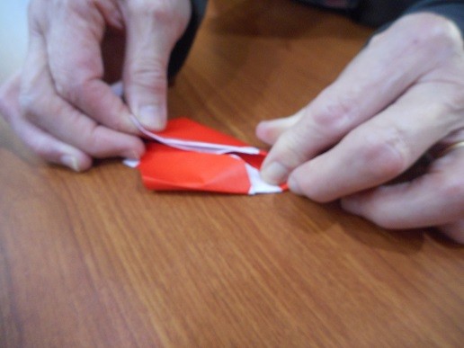 赤色のほうへ折り曲げていきます。