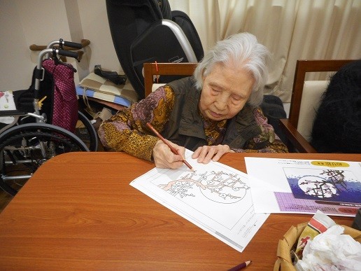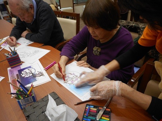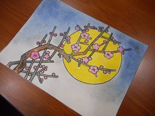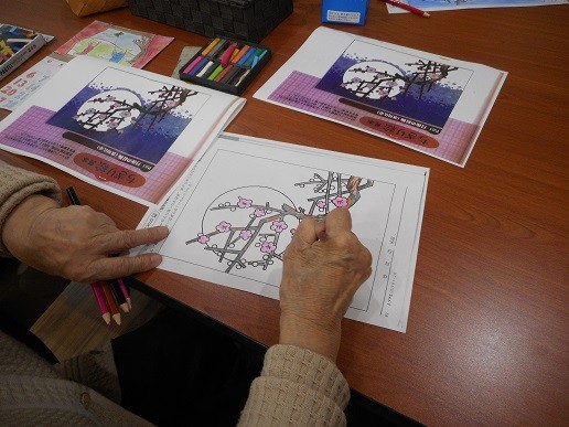 「月夜の紅梅」を皆さんで色鉛筆とパステルで塗っていただきました~