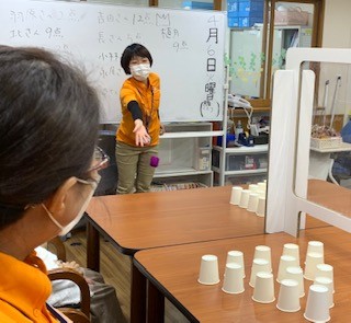紙コップを順番に並べ、ボールはお手玉を使用します('ω')