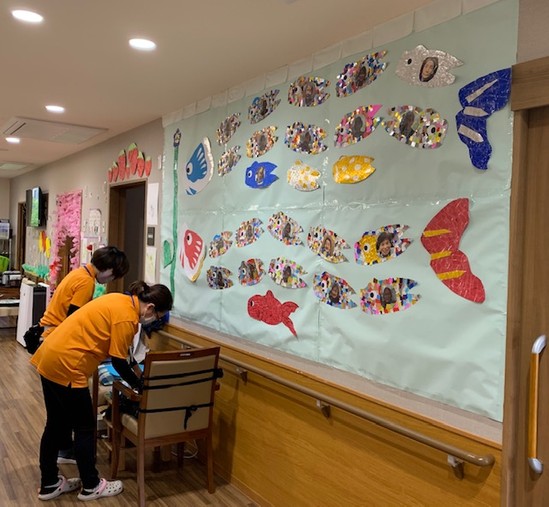 「背が高い利用者さんは上にしようか」「いいですね~^^」などと相談しながら、飾りつけていたので見計らって写真をパチリ★( *´艸`)