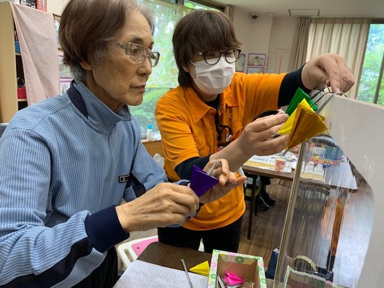 デイルーム内でもカラフルでかわいい傘が沢山出来上がっています(*´ω`*)