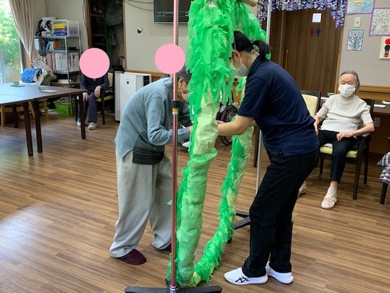大きな新聞の輪っかに、お花紙で作ったひらひらが沢山ついており、